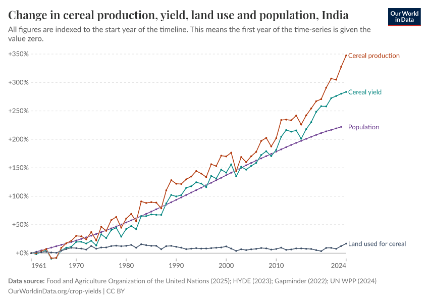 Hannah Ritchie (2017) - “Yields vs. land use: how the Green Revolution enabled us to feed a growing population” Published online at OurWorldinData.org. Retrieved from: 'https://owid-bot-svg-tester-thumbnai.owid.pages.dev/yields-vs-land-use-how-has-the-world-produced-enough-food-for-a-growing-population' [Online Resource]BibTeX citation